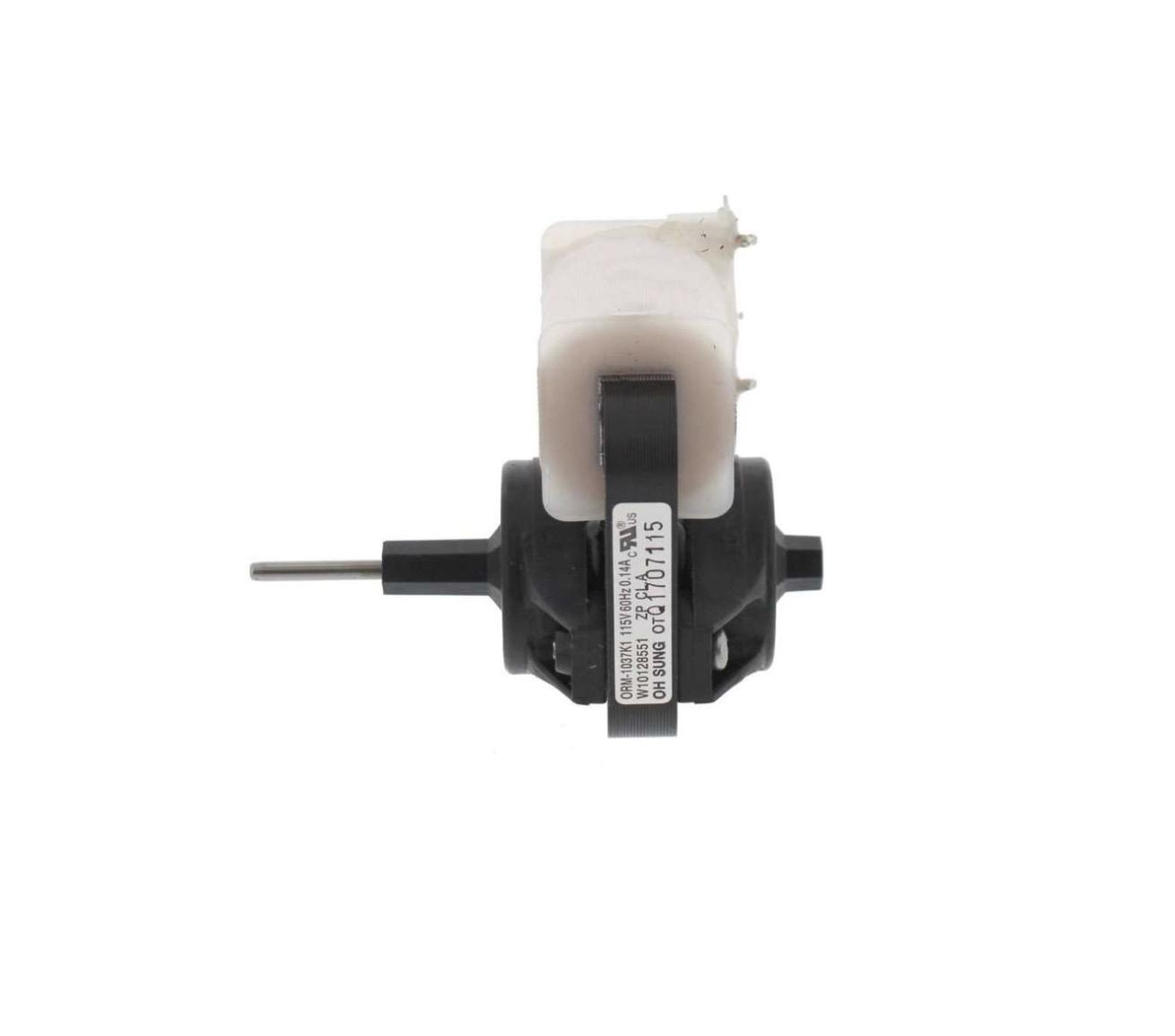 Whirlpool Genuine OEM WPW10128551 Refrigerator Evaporator Fan Motor. The evaporator fan motor circulates air through the fresh food compartment for efficient cooling.